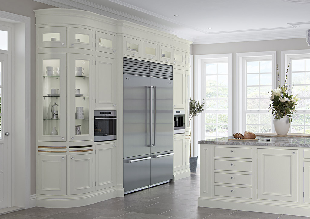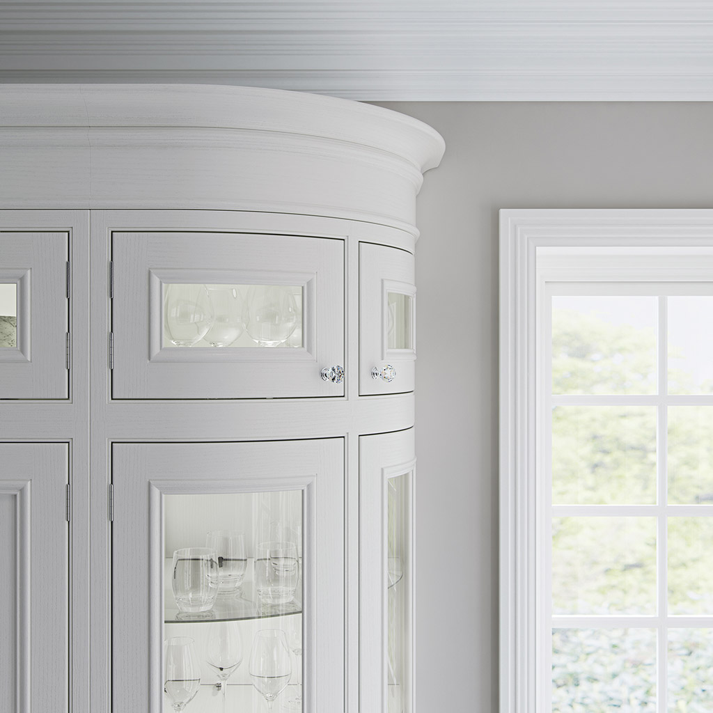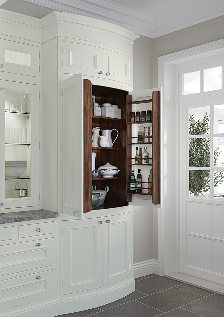 Curves and bows contribute to the complexity of Charlotte’s craftsmanship, featuring frames with curved glass, curved and bowed doors, curved inset chopping boards and a bowed pantry unit with Walnut spice racks (also bowed). When it comes to classic luxury you need not look further than the Charlotte kitchen. The kitchen shown here features Charlotte Painted Porcelain (full kitchen) with Walnut internal accessories and Oak chopping boards.