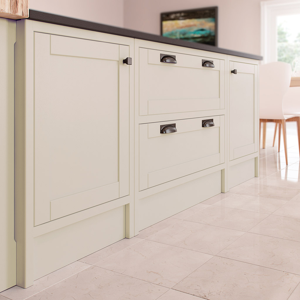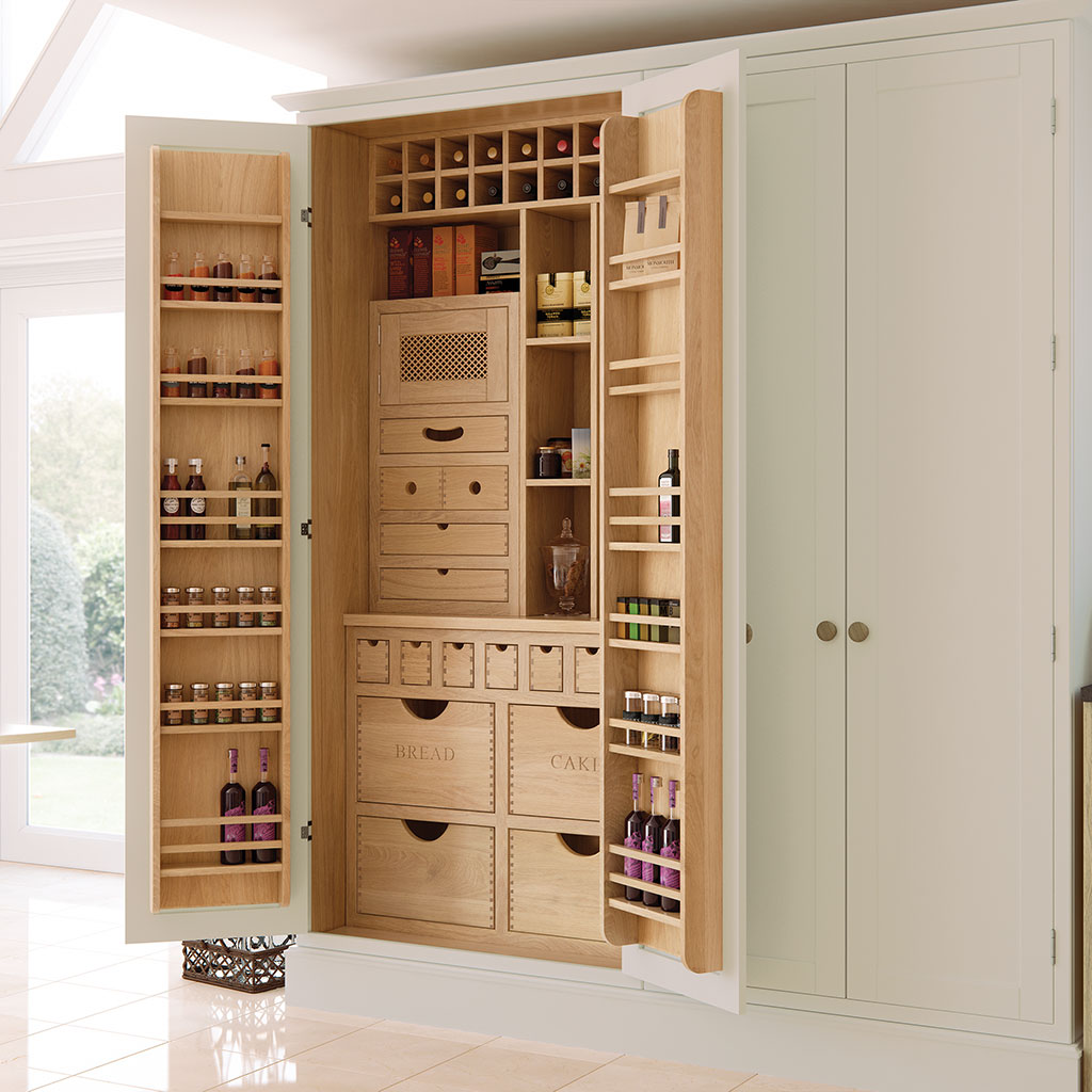 The kitchen shown here features Edmonton Painted White Cotton (island) and Edmonton White Oak (wan & base units, tallhousings, overmantle) with Oak internal accessories.