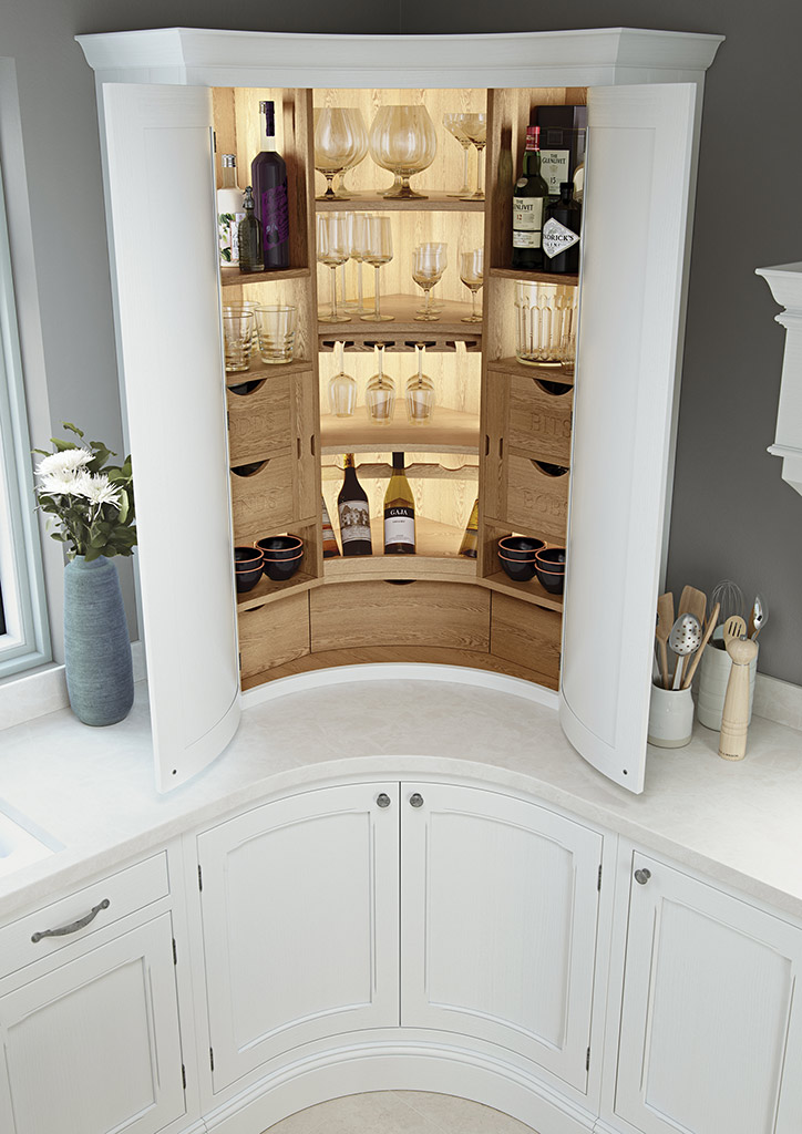 Always dreamed of having your own drinks cabinet? Make it a reality! Nestled inside one of our concave pantry units lies a bespoke area for housing all your creative cocktail accoutrements including glass holder, inset chopping boards (for lemons & limes), bottle rack and concave scalloped drawers, all enhanced by internal LED lighting. Cocktail anyone?