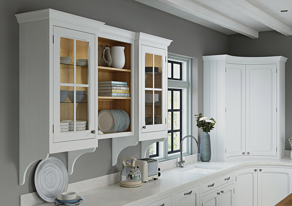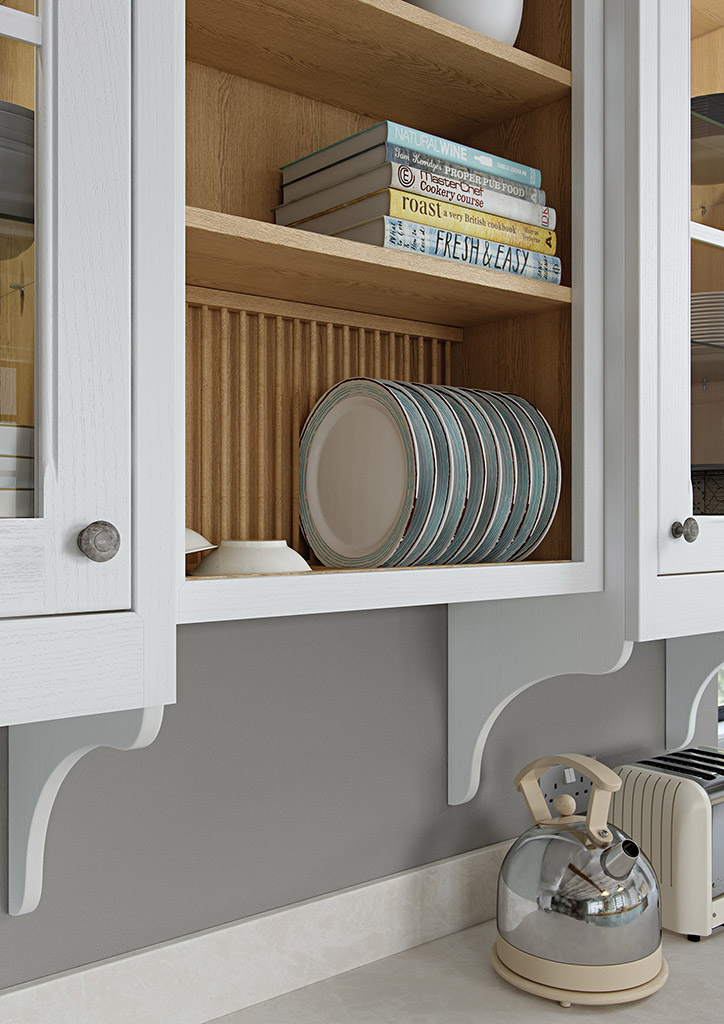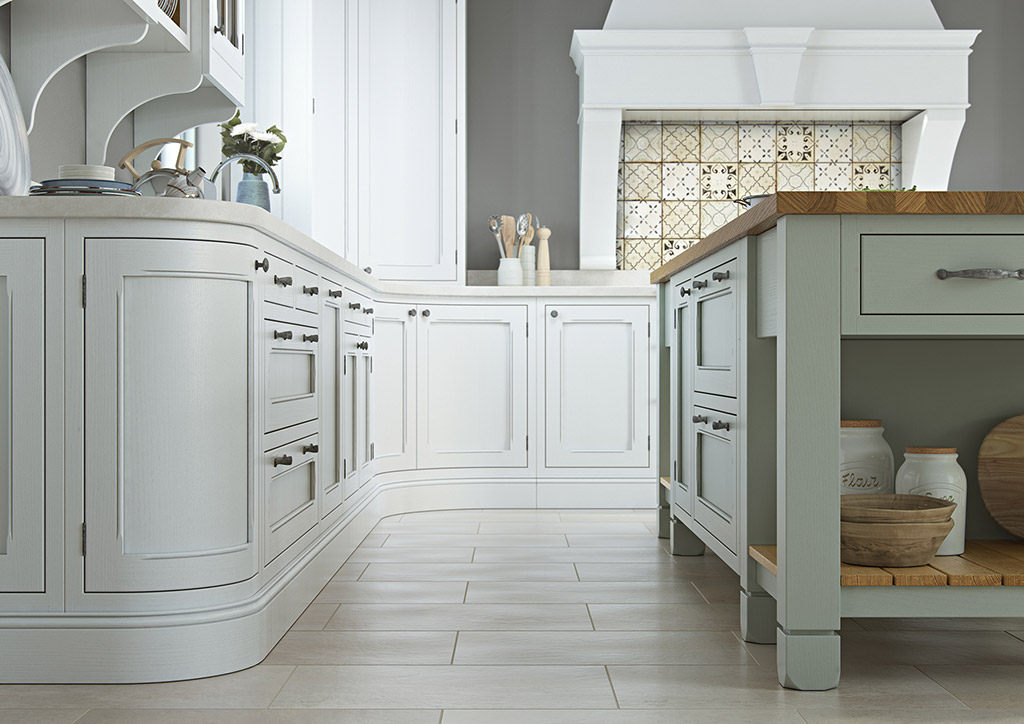 The kitchen shown here features Hawkesbury Painted Brilliant White (wall & base units, concave pantry units) and Sage Green (dresser & island) with Oak internal accessories.