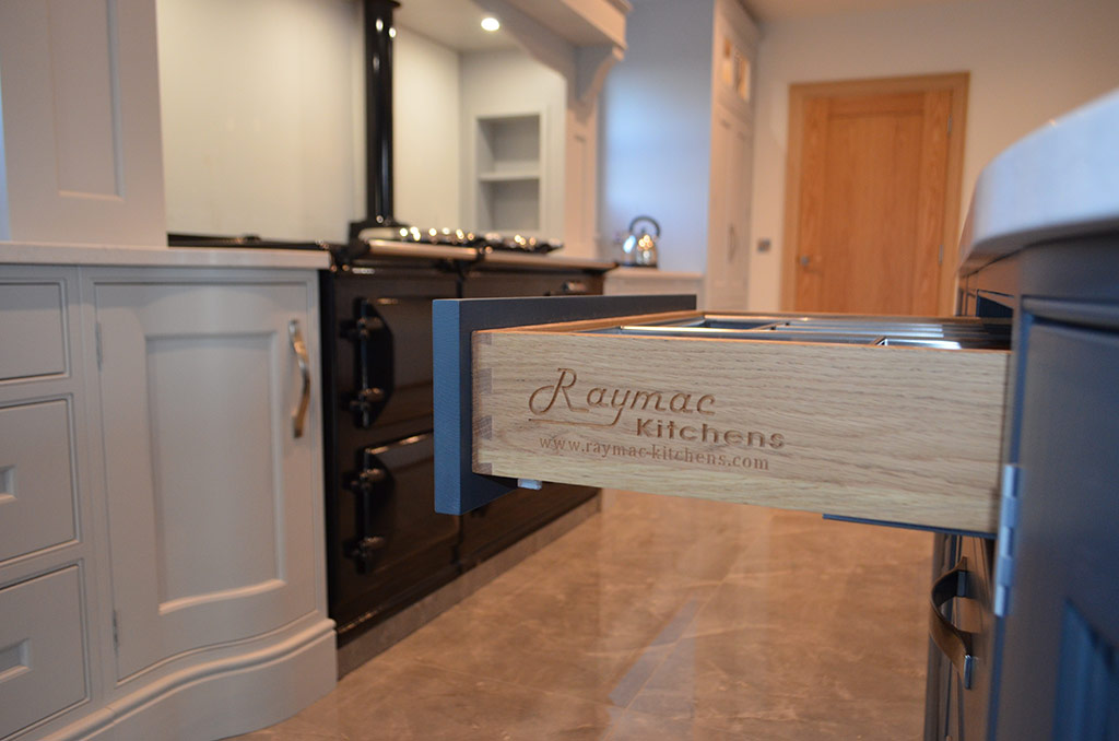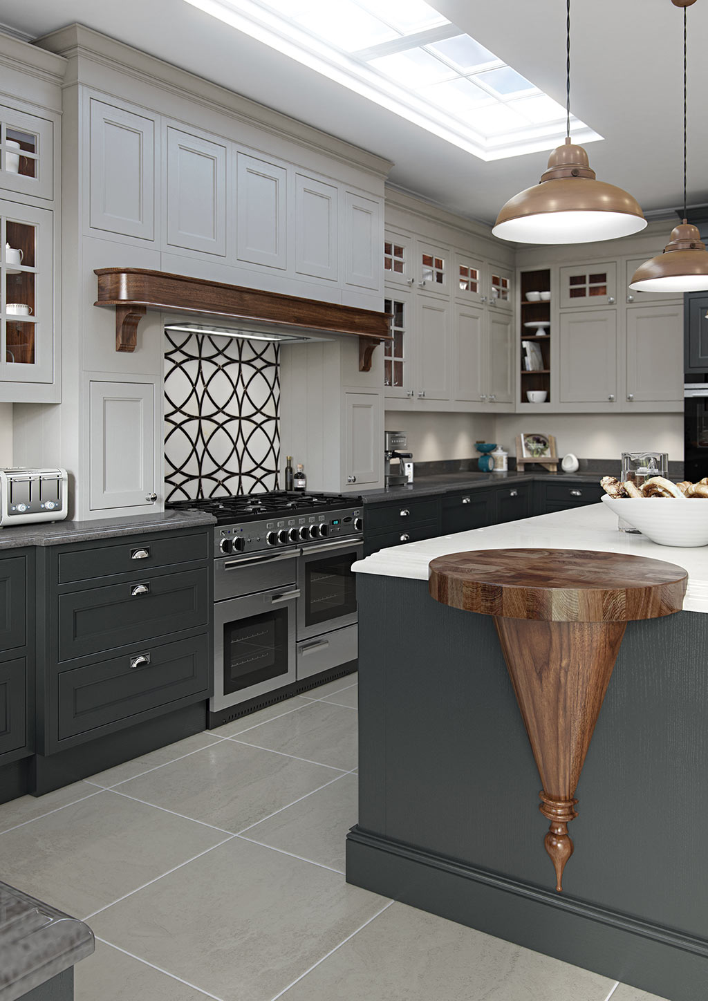 The rich, luxurious Walnut finish used for several of the accessories contrasts exquisitely with its painted surroundings, particularly the mantle shelf which boasts a brand new design featuring consistent colour with no visible end grain. The painted island is embellished with a Walnut conical pedestal at one end, and barrel unit with Walnut inset chopping boards at the other end, ideally suited to bustling family life, affording plenty of added space for food preparation. The custom-made breakfast bar is supported by solid Walnut corbals.