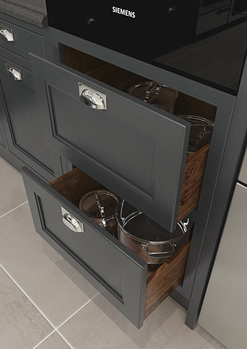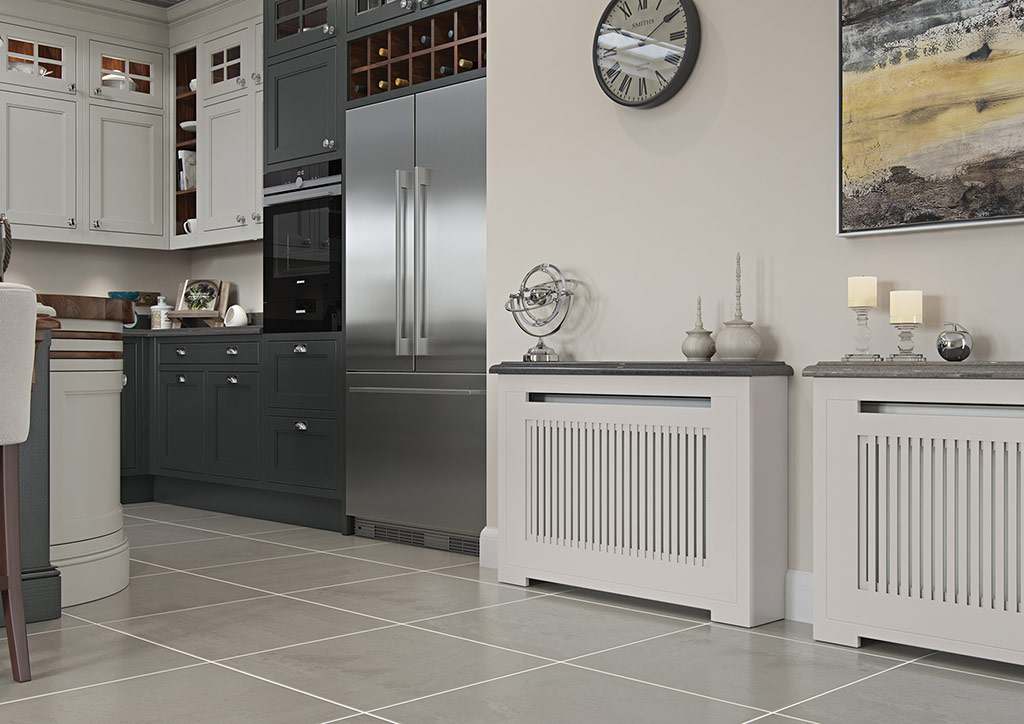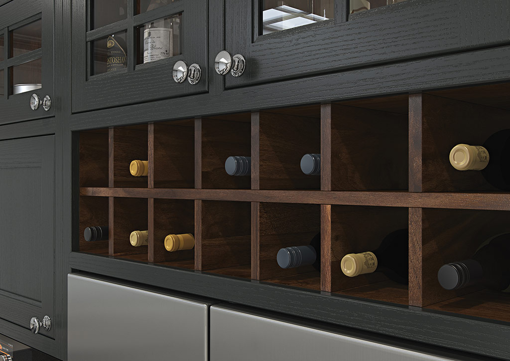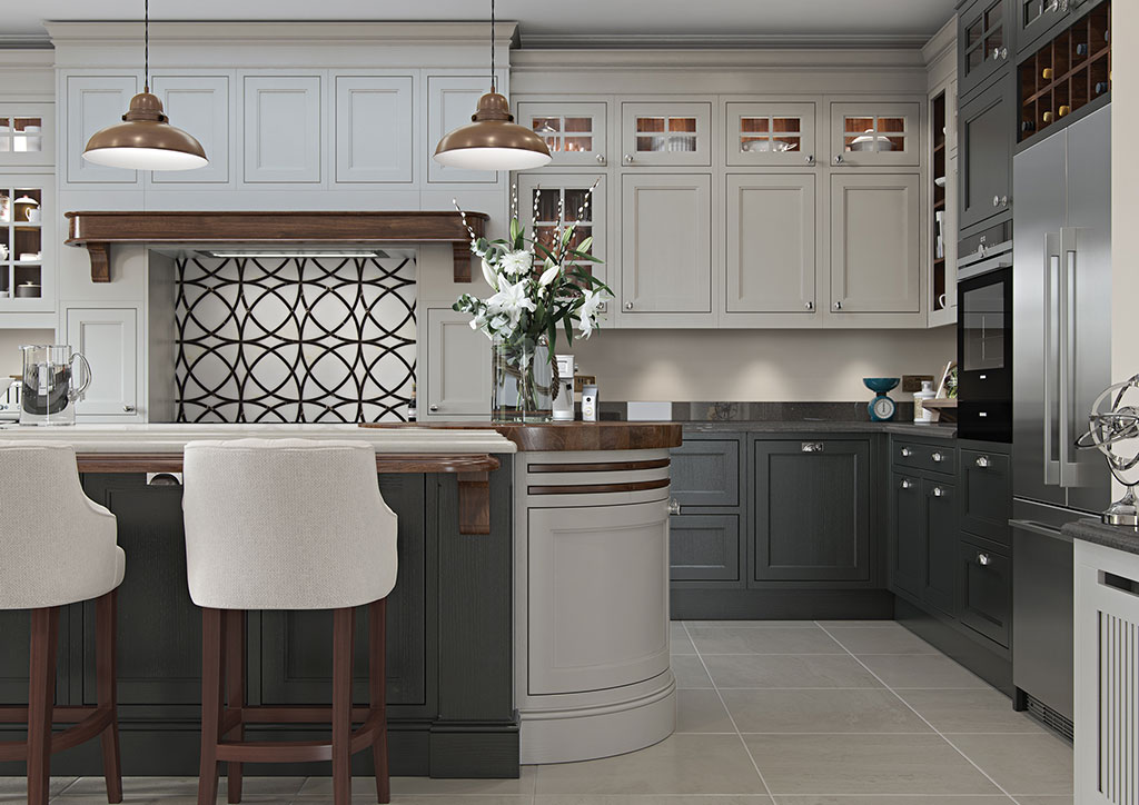 Other accessories include tongue & groove moulded gables, bridging wine rack and decorative radiator screens, painted to match the rest of the kitchen. The kitchen shown here features Sutton Painted Shell (wall units, barrel unit, overmantle), Graphite (base units, units above fridge freezer, island) and Sutton Walnut (mantle shelf, breakfast bar with corbals) and Walnut internal accessories.
